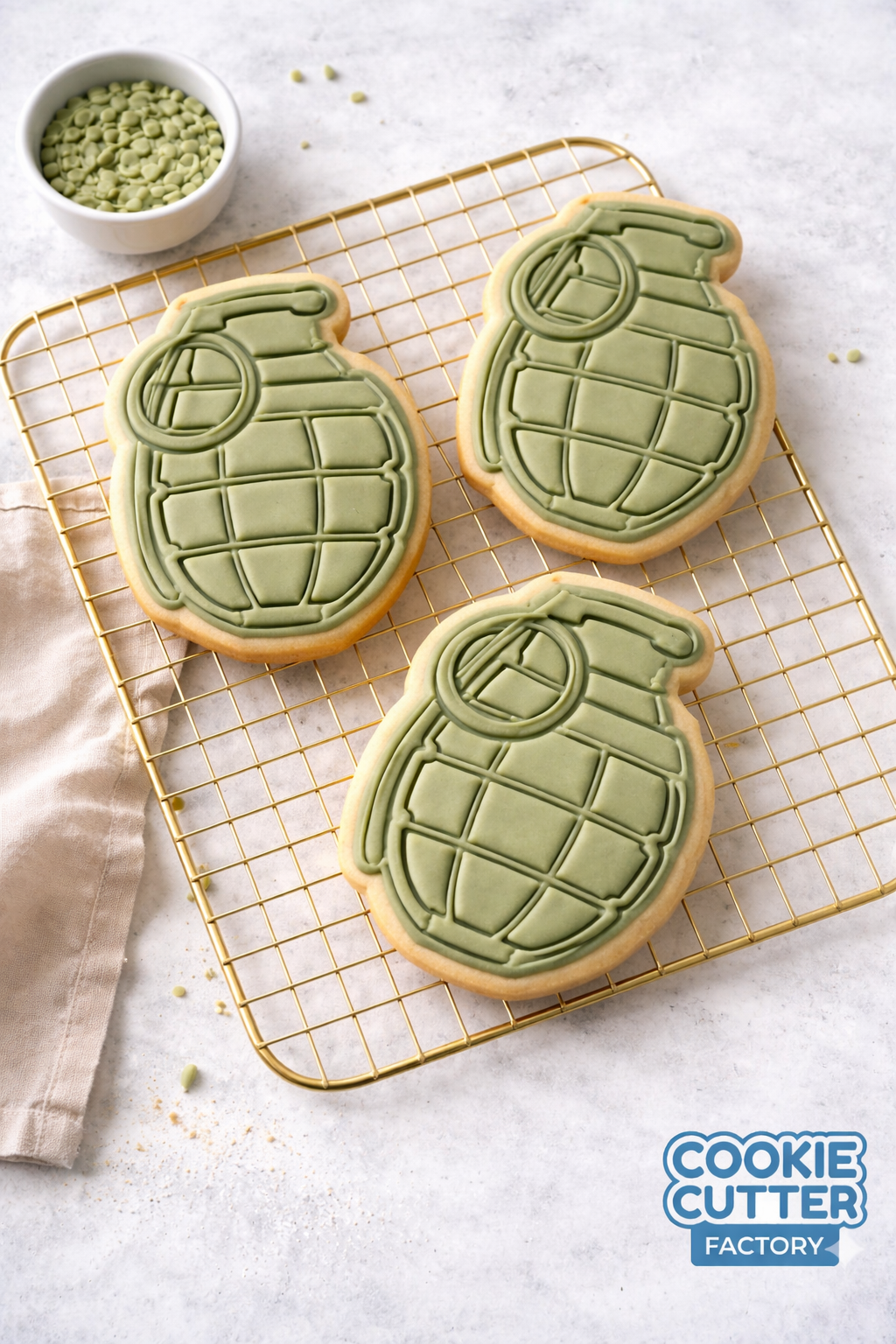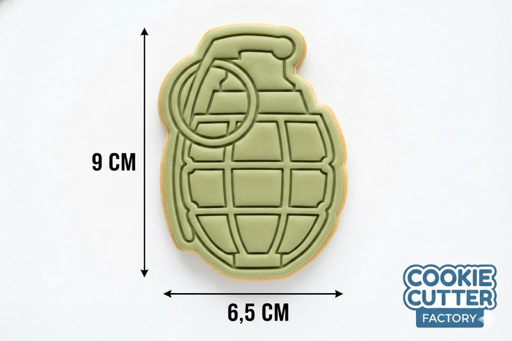 Add a blast of detail to your next baking project with our Tactical Explosive cookie cutter and embosser. This design features the classic "pineapple" style silhouette of a specialized military device, complete with a safety pin ring and segmented surface texture. It is a bold choice for military-themed parties, bootcamp celebrations, or for fans of action-packed video games and movies. The high-quality embosser ensures that every structural detail is crisply imprinted, making it easy to create professional-looking treats for your favorite soldier or gaming enthusiast.