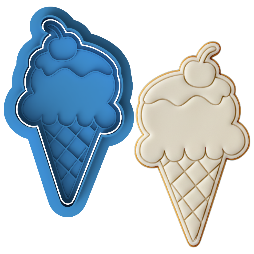 This cutter and embosser set creates detailed ice cream cone cookies, complete with a cherry on top and cone texture. Ideal for decorating with royal icing, fondant, or edible paints.