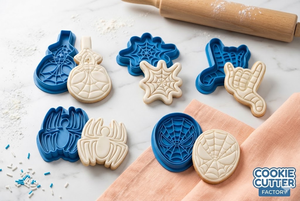 - 5 x Outline Cookie Cutters (Mask, Spider, Web-Shooting Hand, Round Web, Hanging Spider)